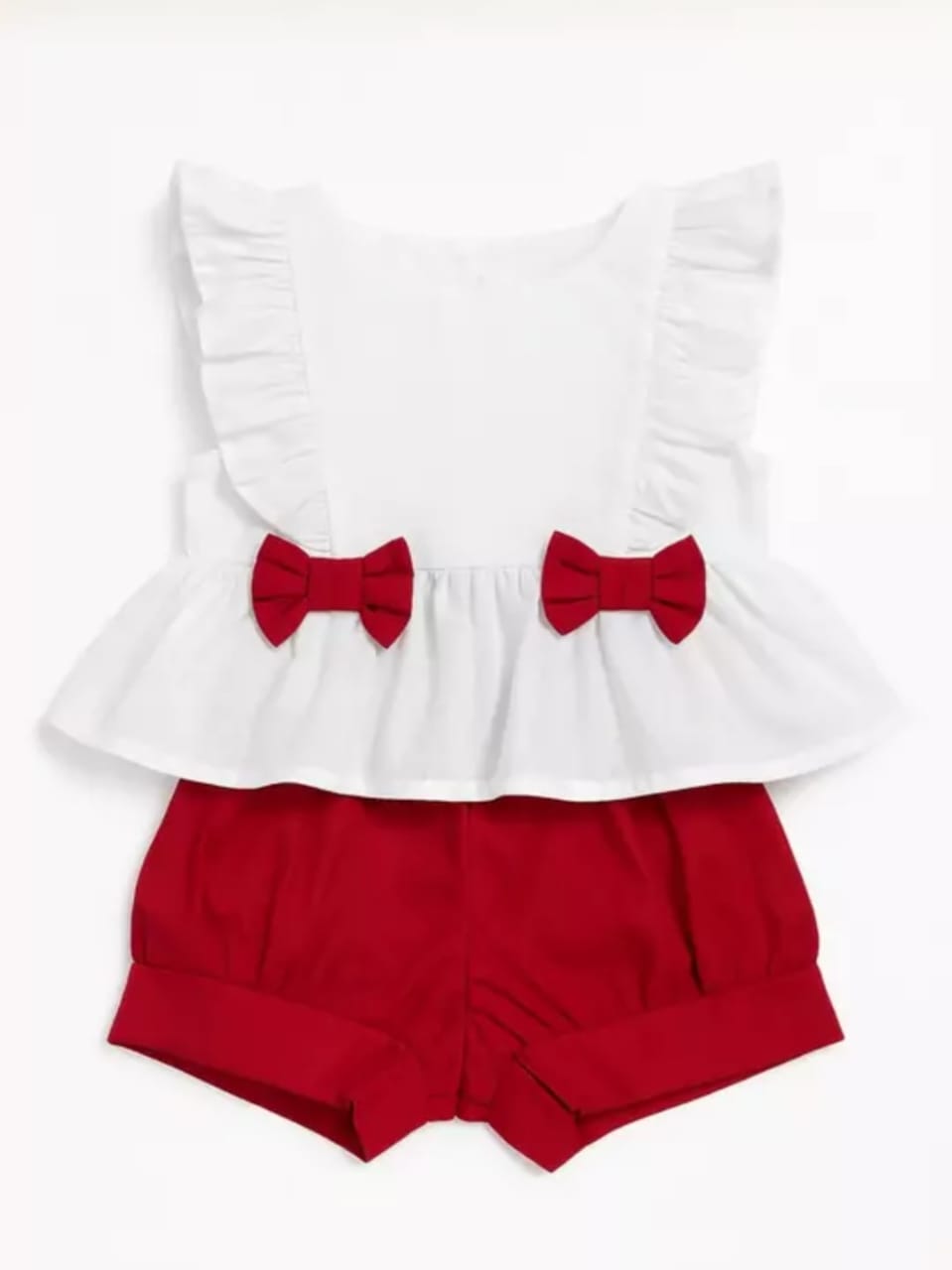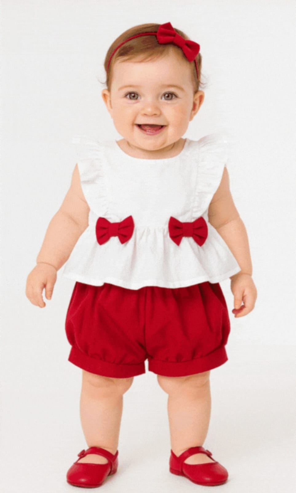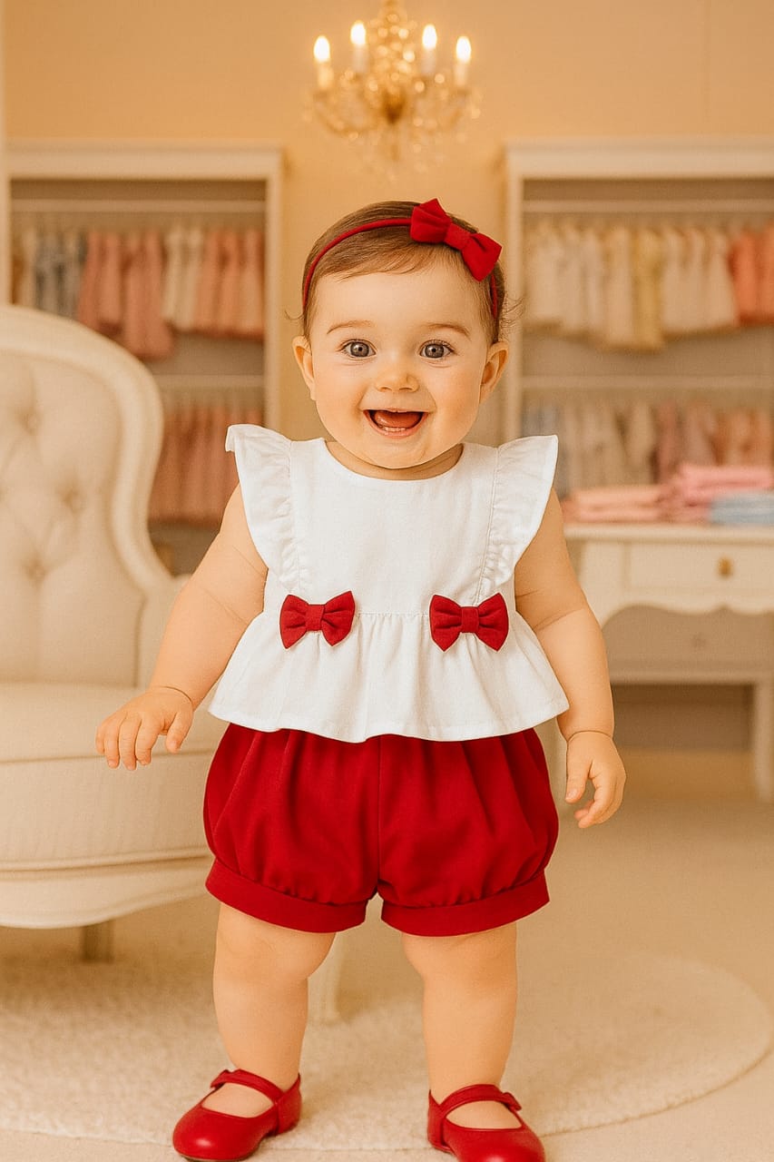 Conjunto de 02 Peças : batinha branca com babados possui 2 lacinhos vermelhos nas laterais e shortinho vermelho com preguinhas, para maior conforto do bebê, feito com tecido tricoline que é um tipo de algodão leve, macio e de textura fina, muito utilizado em vestuário infantil. Possui ótimo caimento (levemente estruturado), é confortável, não retém calor,100% algodão, Liso, suave e resistente. Tecido ideal para proporcionar conforto e comodidade ao bebê. O laço da cabeça não acompanha produto.