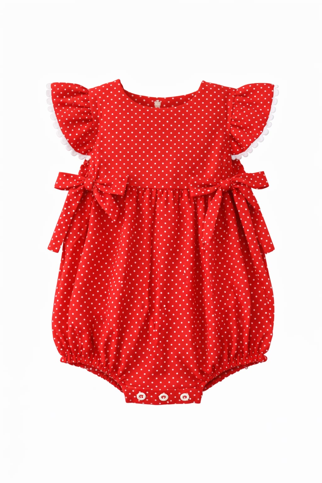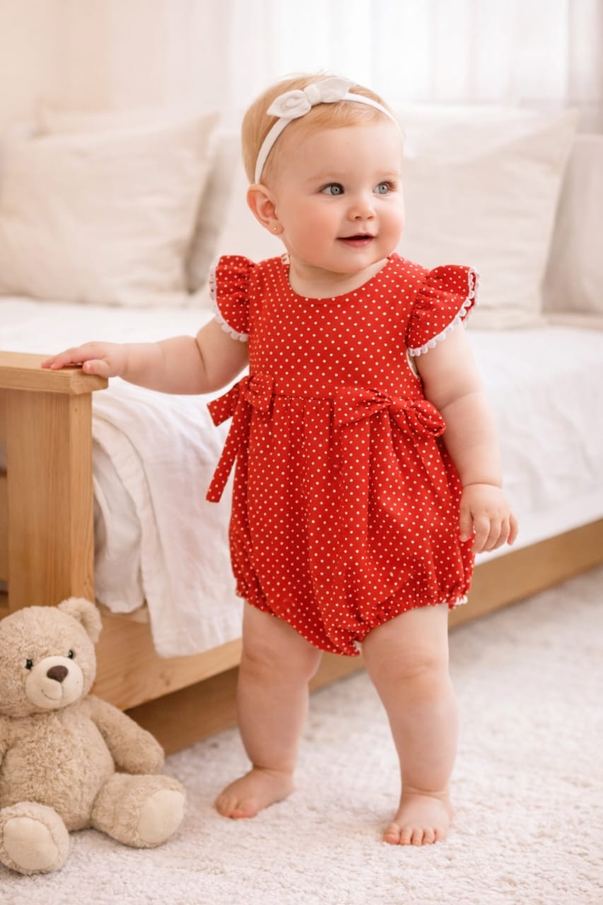 Romper vermelho com poá branco, feito com tecido tricoline que é um tipo de algodão leve, macio e de textura fina, muito utilizado em vestuário infantil. Possui ótimo caimento (levemente estruturado), é confortável, não retém calor,100% algodão, Liso, suave e resistente. Tecido ideal para proporcionar conforto e comodidade ao bebê. Botões de pressão na abertura das perninhas e na parte de trás, para mais facilidade da mamãe nas trocas das fraldinhas.